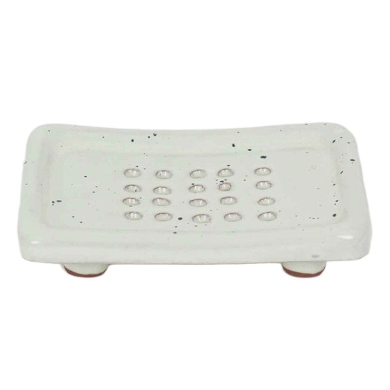 Tvålkoppen med små ben är tillverkad för hand av hållbart stengods. Den blanka glasyren är ljust grå med små oregelbundna svarta prickar.