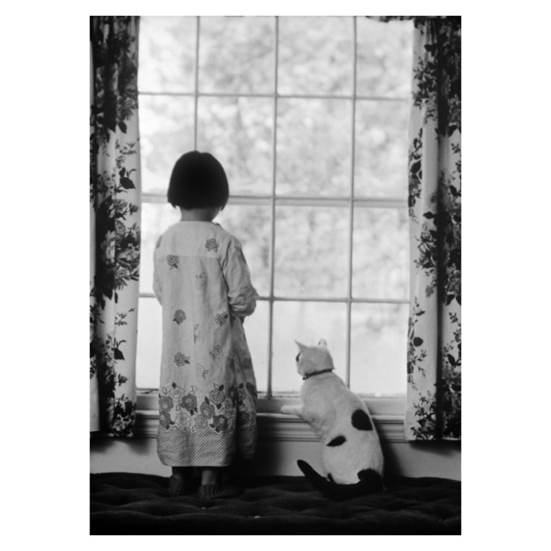 Kort med motiv: Molly och Jules står och tittar i fönstret i väntan på brevbäraren 1960.