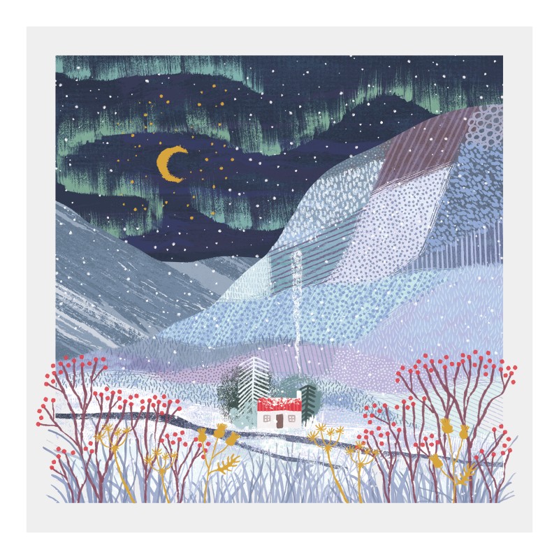 Kort med motiv: norrsken över bergen och stugan, det snöar och stugan värms av en brasa. Guld-detaljer i glansig guld.