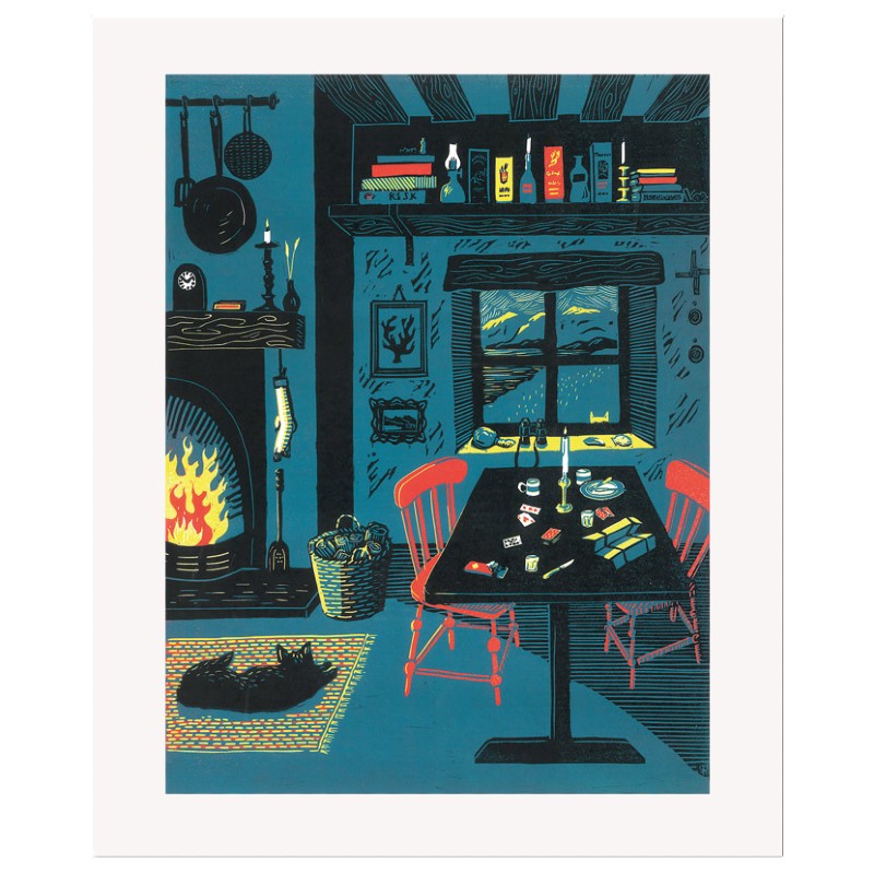 Kort med motiv: i en stuga klockan tio över tio. En brasa är tänd där en katt ligger och värmer sig.