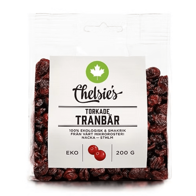 Chelsie's ekologiska torkade tranbär är vackert djupröda med en sötsyrliga smak. De passar fint att använda i matlagning, bakning och desserter eller som ett snack, gärna tillsammans med nötter och mörk choklad.