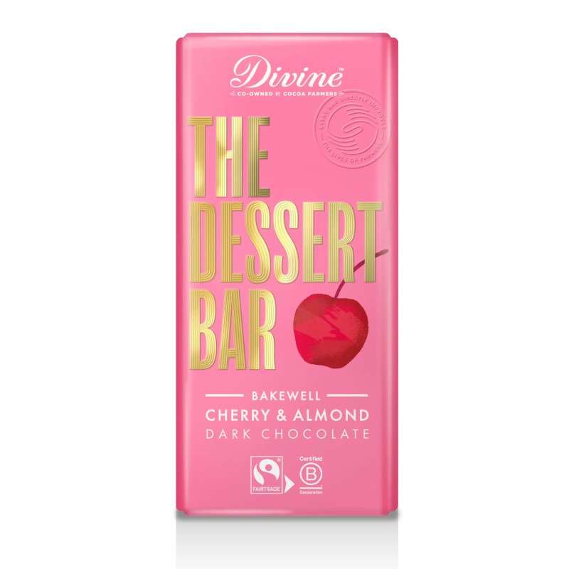 Divine Dessert Cherry & Almond 180g . Dubbelt så stor som de vanliga chokladkakorna från Divine!