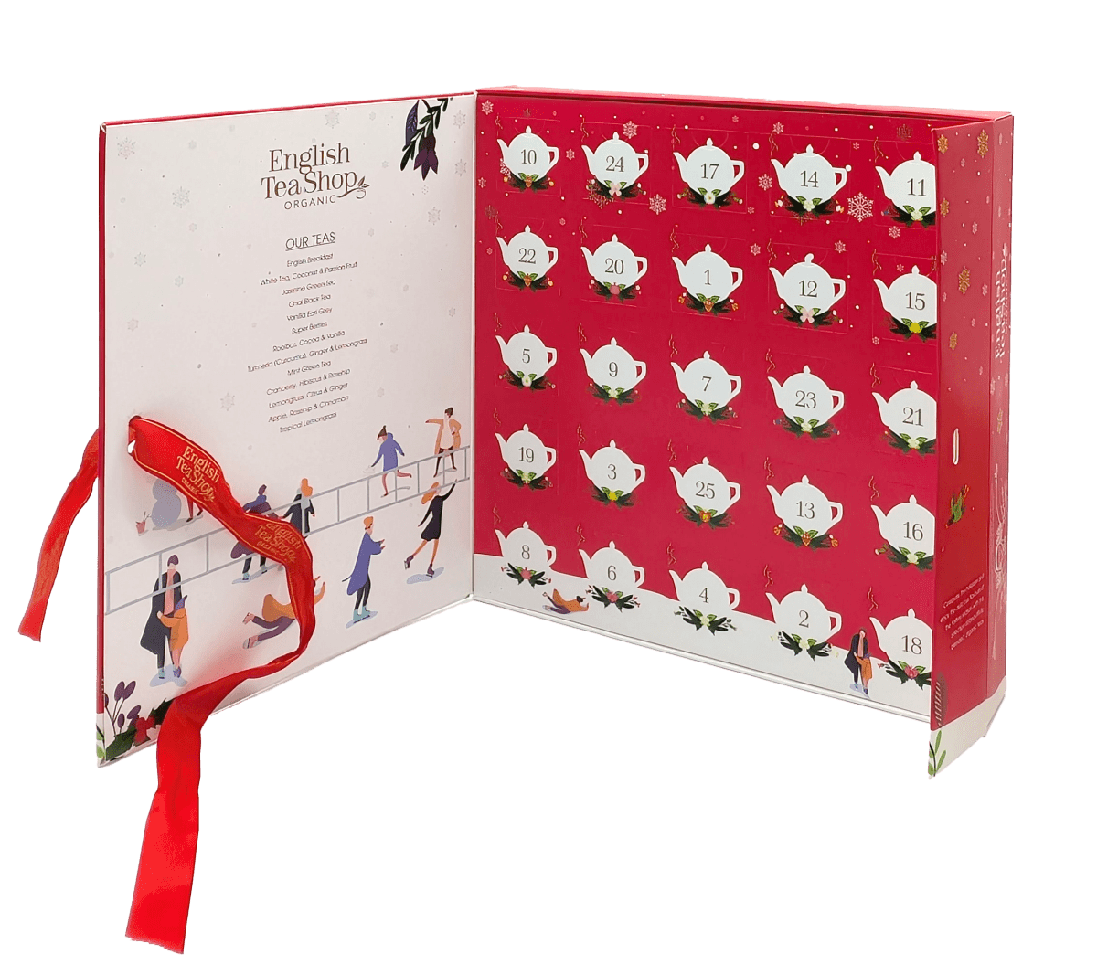 Innehåller 25 noggrant utvalda tepåsar i 13 olika smaker som förenar bekvämlighet med högsta kvalitet. Hållbart odlade och etiskt framställda – alla adventskalendrar från English Tea Shop är koldioxidneutrala och packas i miljövänliga anläggningar för en grönare planet.