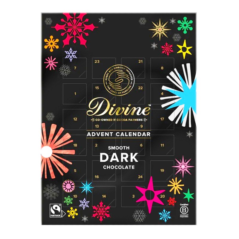 Räkna ner dagarna fram till jul med denna Adventskalender från Divine, fylld med läcker mörk choklad bakom varje lucka.
