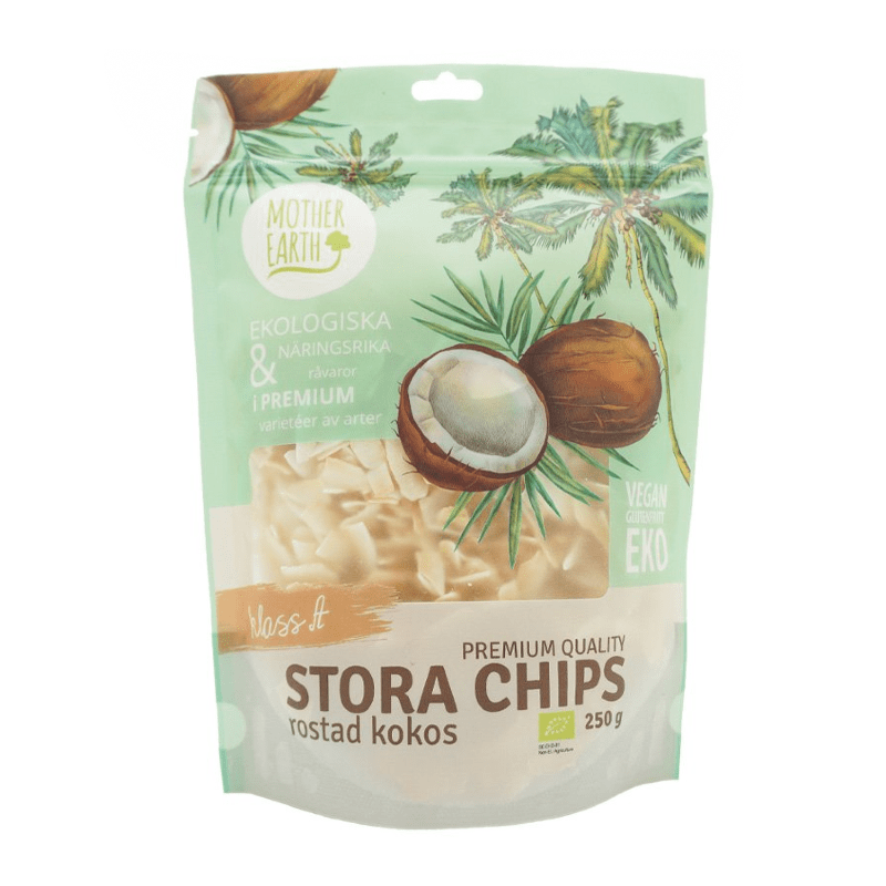 Mother Earths rostade kokoschips är gjorda av färskt kokoskött som skivats i tunna strimlor och sedan varsamt rostats för att ge en perfekt balans mellan kokosarom, krämighet och rostade toner. Dessa chips är en utsökt snack som kan användas som ett gott tillbehör till olika maträtter eller som ett smaskigt mellanmål.